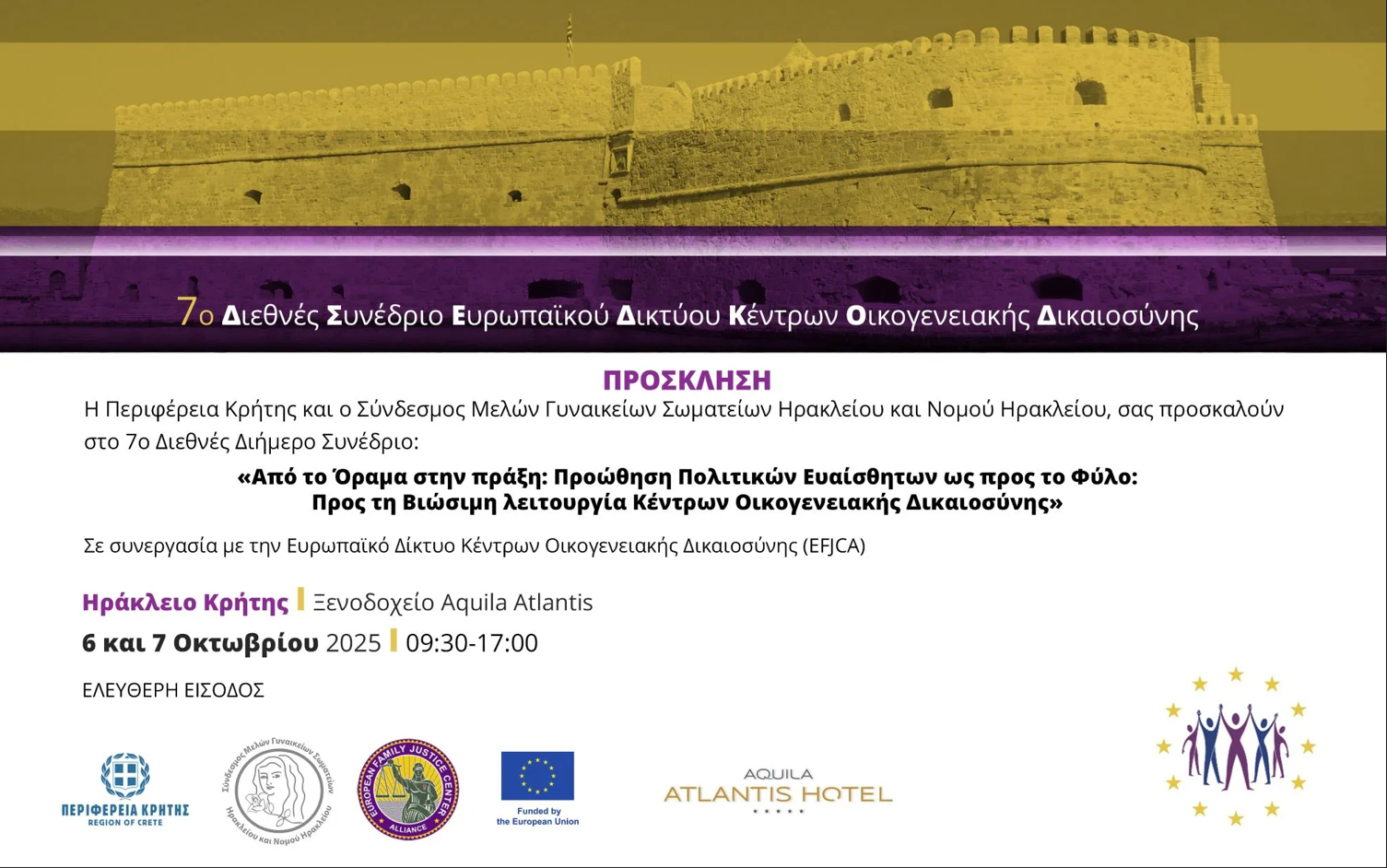 Η Περιφέρεια Κρήτης και ο Σύνδεσμος Μελών Γυναικείων Σωματείων Ηρακλείου και Νομού Ηρακλείου, σε συνεργασία με το Ευρωπαϊκό Δίκτυο Κέντρων Οικογενειακής Δικαιοσύνης (EFJCA) διοργανώνουν στο Ηράκλειο το 7ο Διεθνές Διήμερο Συνέδριο «Από το Όραμα στην πράξη: Προώθηση Πολιτικών Ευαίσθητων ως προς το Φύλο: Προς τη Βιώσιμη λειτουργία των Κέντρων Οικογενειακής Δικαιοσύνης», τη Δευτέρα 6 και την Τρίτη 7 Οκτωβρίου 2025, 9:30π.μ.-5:00μ.μ. στο ξενοδοχείο «Aquila Atlantis», με ελεύθερη είσοδο για το κοινό.