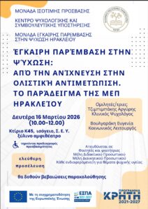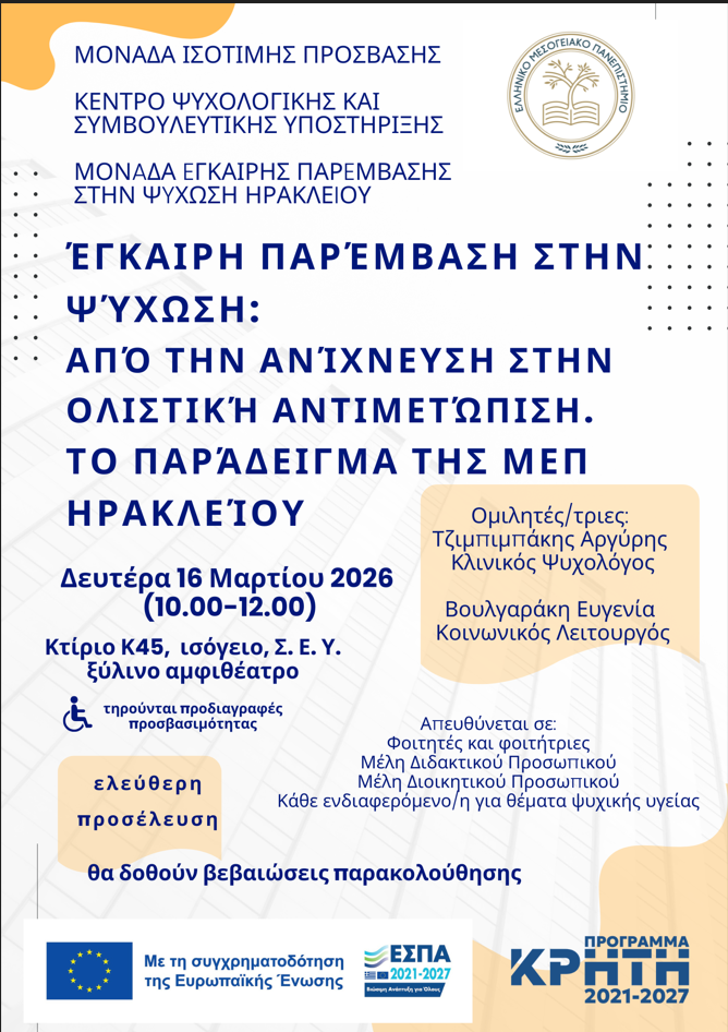 Η Μονάδα Ισότιμης Πρόσβασης Ατόμων με Αναπηρία και Ατόμων με Ειδικές Εκπαιδευτικές Ανάγκες και το Κέντρο Ψυχολογικής και Συμβουλευτικής Υποστήριξης του Ελληνικού Μεσογειακού Πανεπιστημίου σε συνεργασία με τη Μονάδα Έγκαιρης Παρέμβασης στην Ψύχωση Ηρακλείου σας προσκαλούν στην ομιλία με τίτλο: