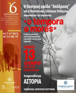 Η θεατρική ομάδα απόδραση του Πολιτιστικού Συλλόγου Ρεθύμνου το Σάββατο 13 Δεκεμβρίου στις 20.30 μ,μ στο κινηματοθέατρο ‘’Αστόρια’’ παρουσιάζουν την παράσταση ‘’O TEMPORA O MORES’’ πού πραγματεύεται το καυτό πρόβλημα των κοινωνικών ανισοτήτων και διακρίσεων, στην Ελλάδα και τον κόσμο διαχρονικά.